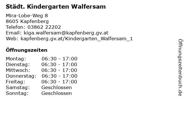 1 Städt. Kindergarten Kapfenberg Walfersam (Entfernung: 0,01 km) Karl-Heinrich-Waggerl-Weg 8, 8605 Kapfenberg 2 4 Städt. Kindergarten Kapfenberg Diemlach (Entfernung: 3,28 km) Gustav-Kramer-Straße 29, 8605 Kapfenberg 6 |