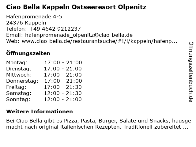 Branchen & Suchbegriffe zu Ciao Bella Kappeln Ostseeresort Olpenitz:bella, ciao, cocktails, eis, hundefreundlich, italienisch, kuchen, lieferung, olpenitz, ostseeresort, pasta, pizza, restaurant, salat, to go, vegetarisch |