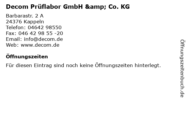 | Öffnungszeiten Decom Prüflabor GmbH & Co. KG in Kappeln anzeigen | |