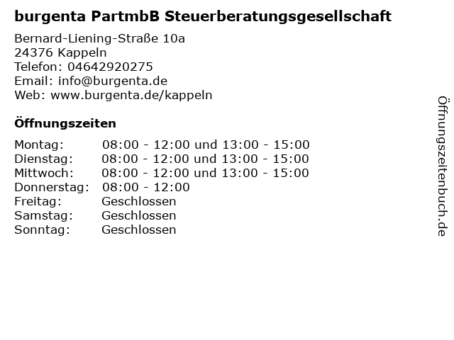 1 burgenta PartmbB Steuerberatungsgesellschaft (Entfernung: 16,82 km) Mühlenfeld 1, 24972 Steinbergkirche 4 Starke & Partner - Wirtschaftsprüfer und Steuerberater (Entfernung: 0,06 km) Bernard-Liening-Straße 10 a, 24376 Kappeln 6 |