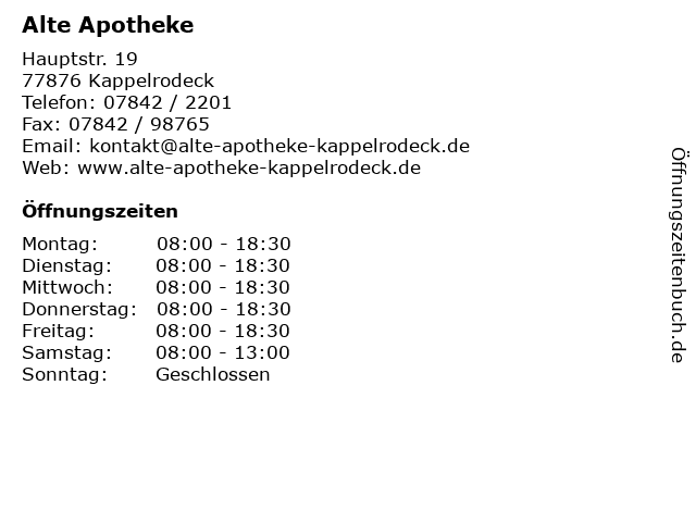 | Öffnungszeiten Alte Apotheke in Kappelrodeck anzeigen | |