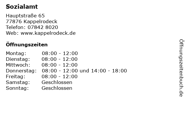 | Öffnungszeiten Sozialamt in Kappelrodeck anzeigen | |