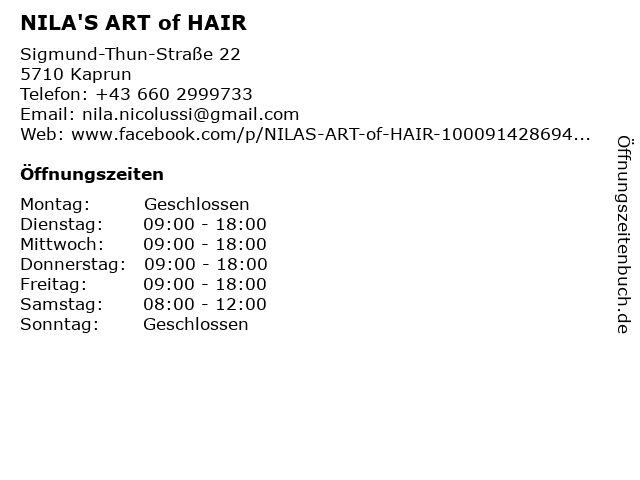 | Öffnungszeiten NILA'S ART of HAIR in Kaprun anzeigen | |