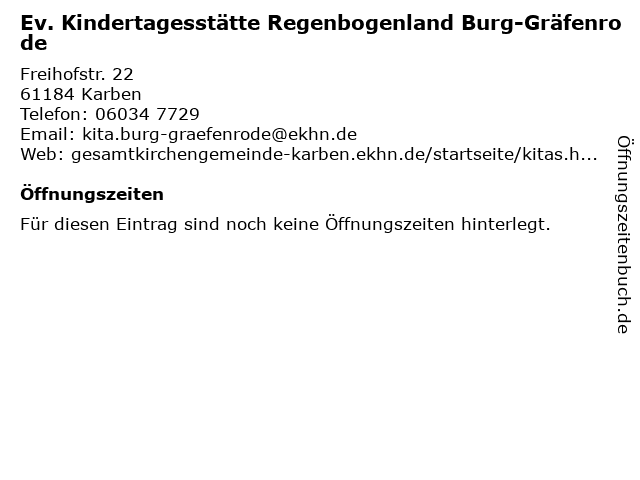 | Ev. Kindertagesstätte Regenbogenland Burg-Gräfenrode anrufen | |