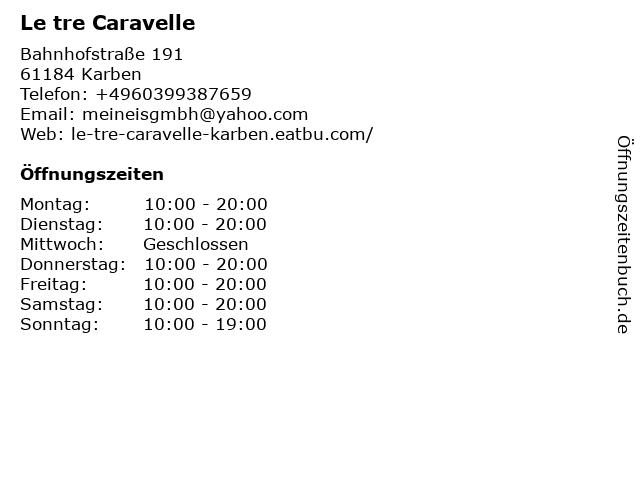 Öffnungszeiten Le tre Caravelle in Karben anzeigen | |
