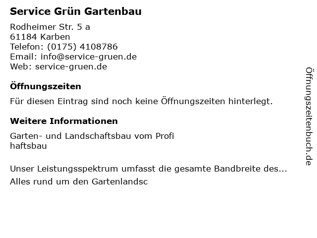 | Öffnungszeiten Service Grün Gartenbau in Karben anzeigen | |