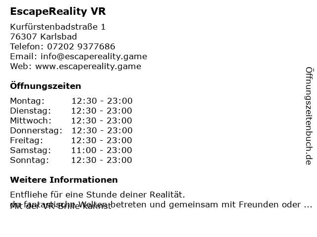 | Öffnungszeiten EscapeReality VR in Karlsbad anzeigen | |