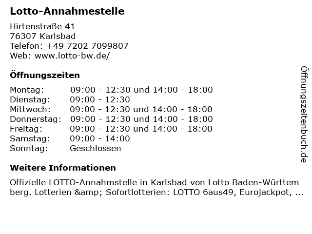 | Öffnungszeiten Lotto-Annahmestelle in Karlsbad anzeigen | |