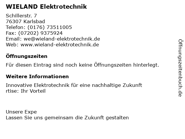 | Öffnungszeiten WIELAND Elektrotechnik in Karlsbad anzeigen | |