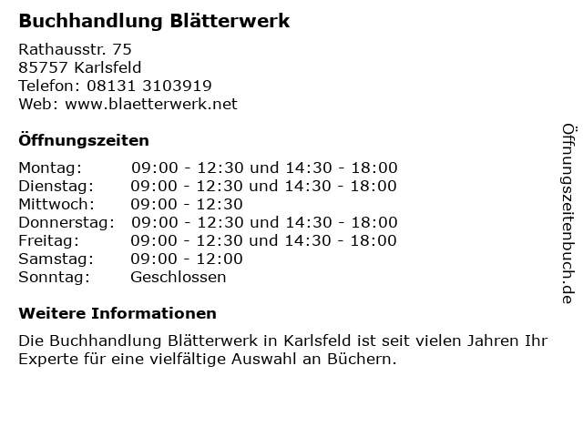 | Öffnungszeiten Buchhandlung Blätterwerk in Karlsfeld anzeigen | |