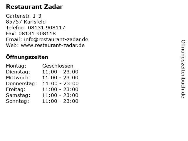 | Öffnungszeiten Restaurant Zadar in Karlsfeld anzeigen | |
