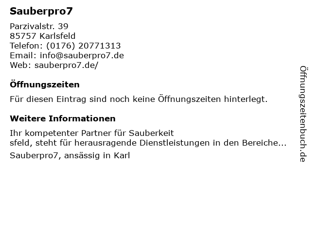 | Öffnungszeiten Sauberpro7 in Karlsfeld anzeigen | |