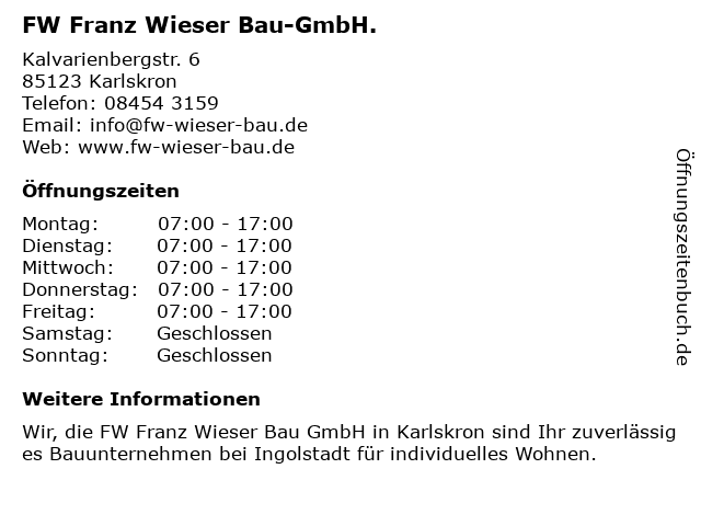 | Öffnungszeiten FW Franz Wieser Bau-GmbH. in Karlskron anzeigen | |