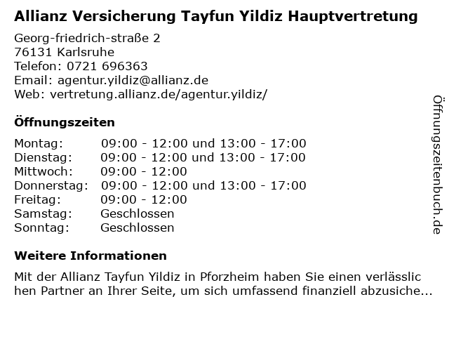 1 AXA Versicherung - Hauptvertretung Jochen Bertsche (Entfernung: 1,19 km) Anna-Lauter-Str. 8, 76137 Karlsruhe 5 Allianz Versicherung Aksoy und Aksoy OHG Hauptvertretung (Entfernung: 3,09 km) Kaiserallee 25 b, 76133 Karlsruhe 6 Allianz Versicherung Michael Jakob Hauptvertretung (Entfernung: 3,27 km) Ernst-Friedrich-Straße 1A, 76227 Karlsruhe |
