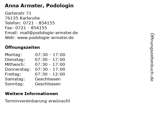 | Öffnungszeiten Anna Armster, Podologin in Karlsruhe anzeigen | |