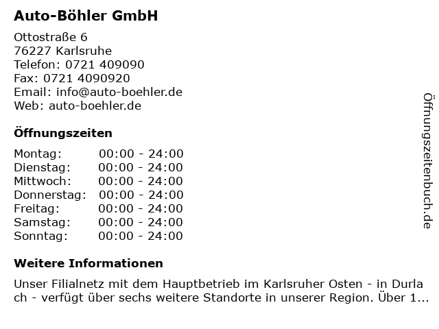 | Öffnungszeiten Auto-Böhler GmbH in Karlsruhe anzeigen | |