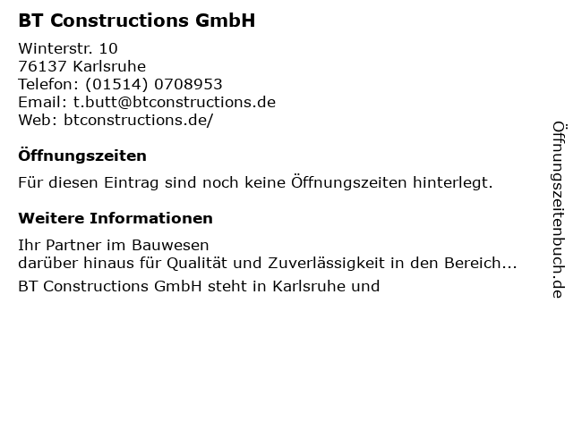 | Öffnungszeiten BT Constructions GmbH in Karlsruhe anzeigen | |