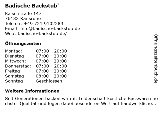 | Öffnungszeiten Badische Backstub' in Karlsruhe anzeigen | |