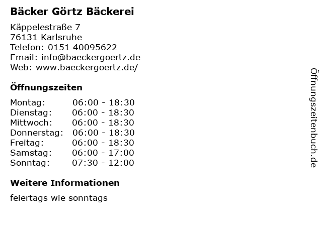 | Öffnungszeiten Bäcker Görtz Bäckerei in Karlsruhe anzeigen | |