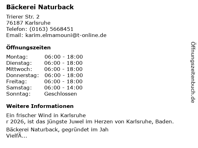 | Öffnungszeiten Bäckerei Naturback in Karlsruhe anzeigen | |