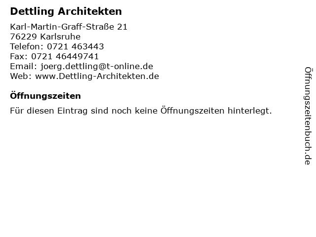 | Öffnungszeiten Dettling Architekten in Karlsruhe anzeigen | |