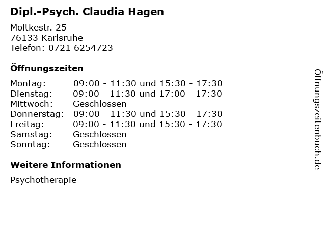 | Öffnungszeiten Dipl.-Psych. Claudia Hagen in Karlsruhe anzeigen | |
