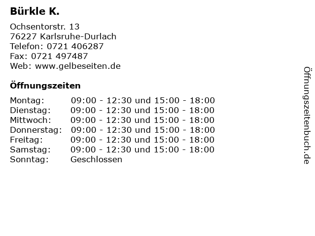 | Öffnungszeiten Bürkle K. in Karlsruhe-Durlach anzeigen | |
