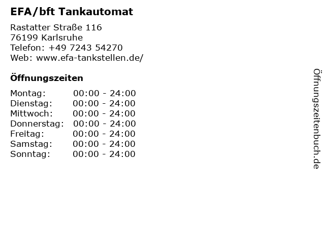 | Öffnungszeiten EFA/bft Tankautomat in Karlsruhe anzeigen | |