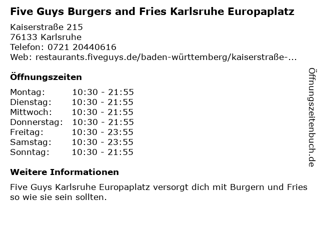 Branchen & Suchbegriffe zu Five Guys Burgers and Fries Karlsruhe Europaplatz:amerikanisches restaurant, and, burgers, europaplatz, fast food und take away, fast-food-restaurant, five, fries, guys, hot-dog-restaurant, restaurants |