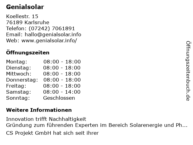 | Öffnungszeiten Genialsolar in Karlsruhe anzeigen | |