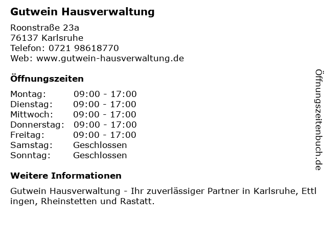 | Öffnungszeiten Gutwein Hausverwaltung in Karlsruhe anzeigen | |