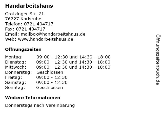 | Öffnungszeiten Handarbeitshaus in Karlsruhe anzeigen | |