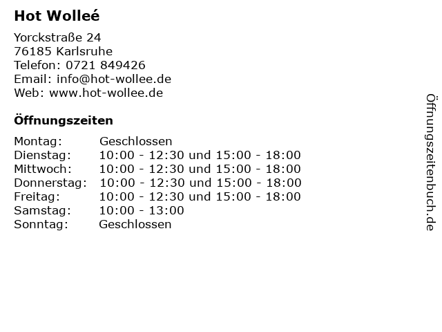 | Öffnungszeiten Hot Wolleé in Karlsruhe anzeigen | |
