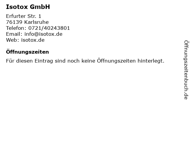 | Öffnungszeiten Isotox GmbH in Karlsruhe anzeigen | |
