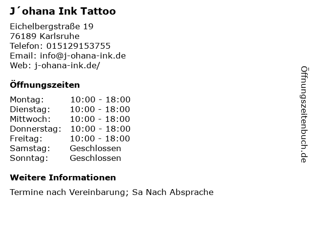 | Öffnungszeiten J´ohana Ink Tattoo in Karlsruhe anzeigen | |