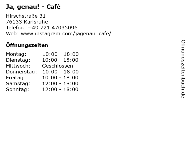 | Öffnungszeiten Ja, genau! - Cafè in Karlsruhe anzeigen | |