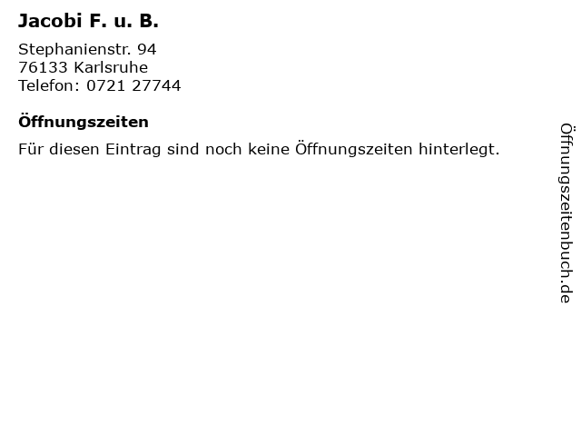 | Öffnungszeiten Jacobi F. u. B. in Karlsruhe anzeigen | |