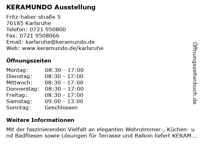 | Öffnungszeiten KERAMUNDO Ausstellung in Karlsruhe anzeigen | |