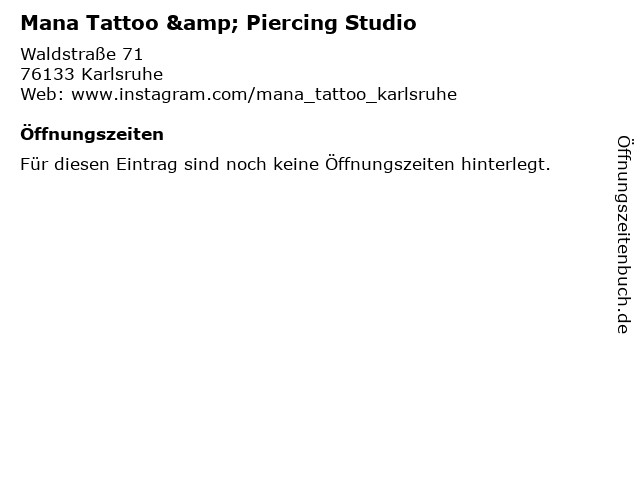 | Öffnungszeiten Mana Tattoo & Piercing Studio in Karlsruhe anzeigen | |