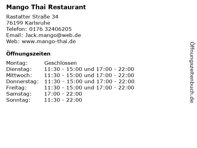 | Öffnungszeiten Mango Thai Restaurant in Karlsruhe anzeigen | |