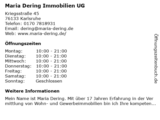 | Öffnungszeiten Maria Dering Immobilien UG in Karlsruhe anzeigen | |
