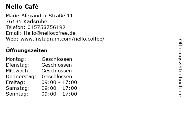 Öffnungszeiten Nello Cafè in Karlsruhe anzeigen | |