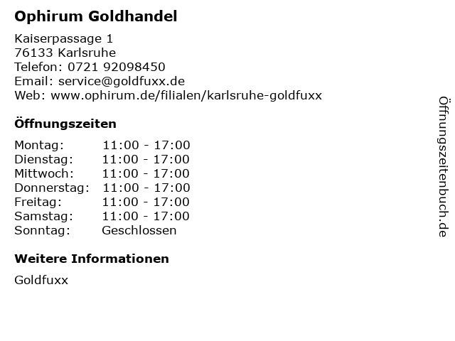 | Öffnungszeiten Ophirum Goldhandel in Karlsruhe anzeigen | |