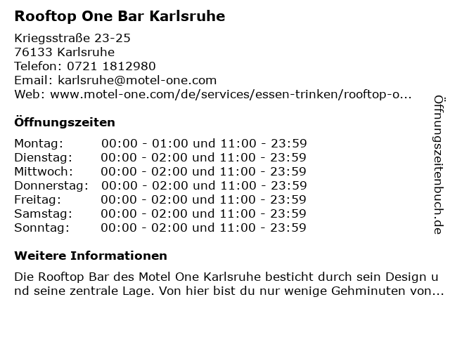 | Öffnungszeiten Rooftop One Bar Karlsruhe in Karlsruhe anzeigen | |
