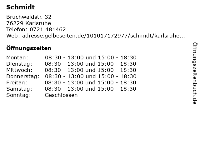 | Öffnungszeiten Schmidt in Karlsruhe anzeigen | |