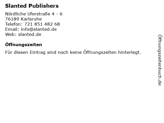| Öffnungszeiten Slanted Publishers in Karlsruhe anzeigen | |