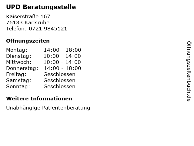 | Öffnungszeiten UPD Beratungsstelle in Karlsruhe anzeigen | |