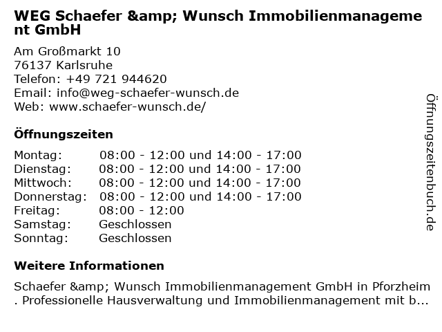 2 WEG Schaefer & Wunsch Immobilienmanagement GmbH Wohnungsunternehmen (Entfernung: 2,49 km) Badener Str. 14, 76227 Karlsruhe 6 VLH | Hans Wunsch - Vereinigte Lohnsteuerhilfe e.V. (Entfernung: 7,79 km) Rheinstr. 78, 76275 Ettlingen |
