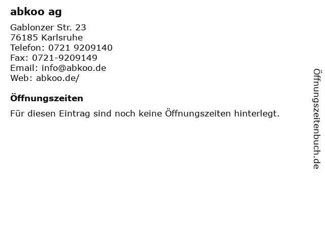 | Öffnungszeiten abkoo ag in Karlsruhe anzeigen | |