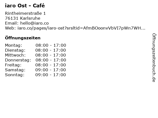 | Öffnungszeiten iaro Ost - Café in Karlsruhe anzeigen | |